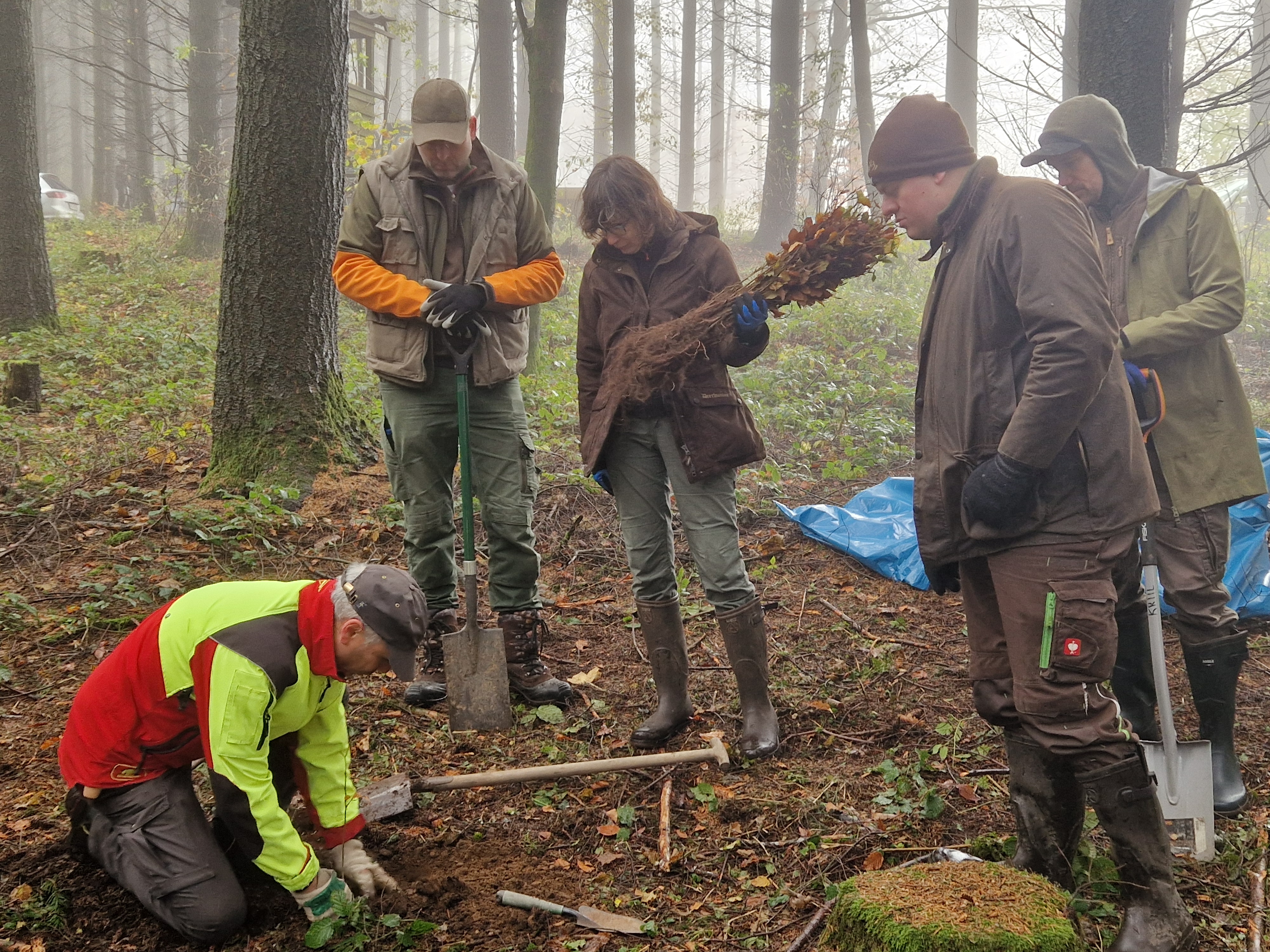 Förster Christof Dickopf (links) erklärt, dass die Buchen am besten mindestens ein Spatenblatt tief und einen Meter voneinander entfernt in sogenannten „Klumpen” unter die Douglasien gepflanzt werden.