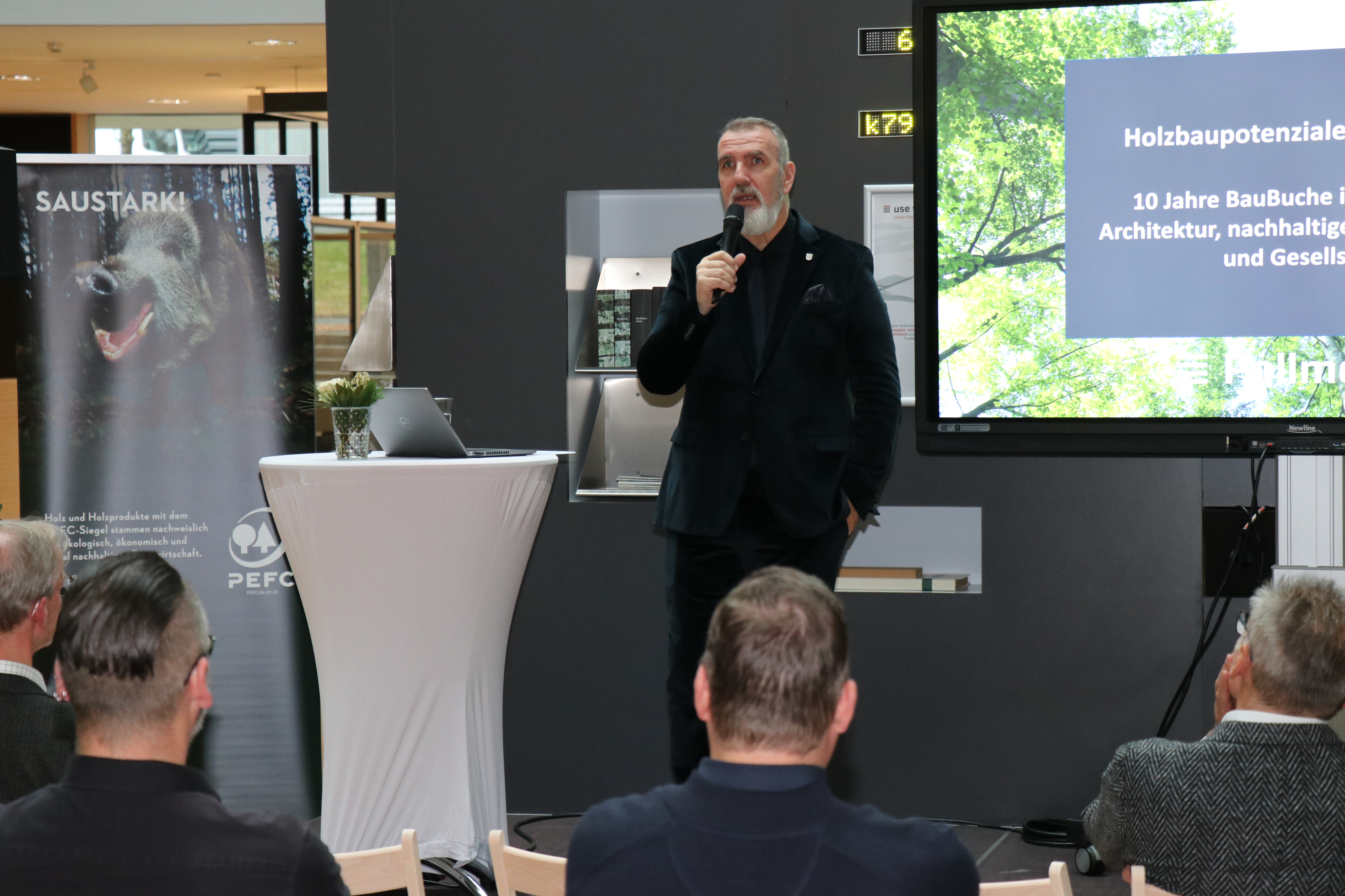 Bereits zu Beginn wurde die strategische Bedeutung des Themas deutlich: In den Grußworten betonten die Veranstalter, dass der Einsatz von heimischem Laubholz – insbesondere von BauBuche – neue Perspektiven sowohl für den klimafreundlichen Umbau der Wälder als auch das nachhaltige Bauen eröffnet.