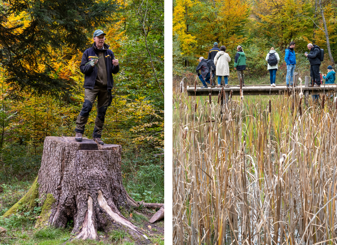 Foto 1: Förster Achim Klausner erläutert dem Publikum, dass der Stamm einer großen Weißtanne als PEFC-Biotopbaum im Wald verbleiben darf. Foto 2: Ein weiteres Foto-Highlight im PEFC-zertifizierten Stadtwald: das Feuchtbiotop. © KOLLAXO Markt und Medien GmbH.