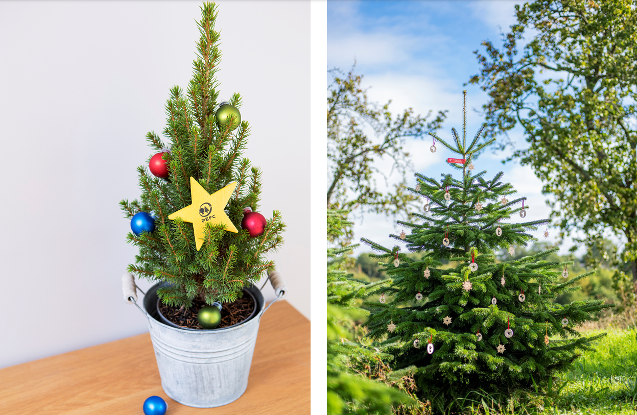 Egal ob klein oder groß: Hauptsache aus nachhaltiger Waldbewirtschaftung oder aus PEFC-zertifizierten Weihnachtsbaumkulturen. Foto rechts: KOLLAXO Markt und Medien GmbH