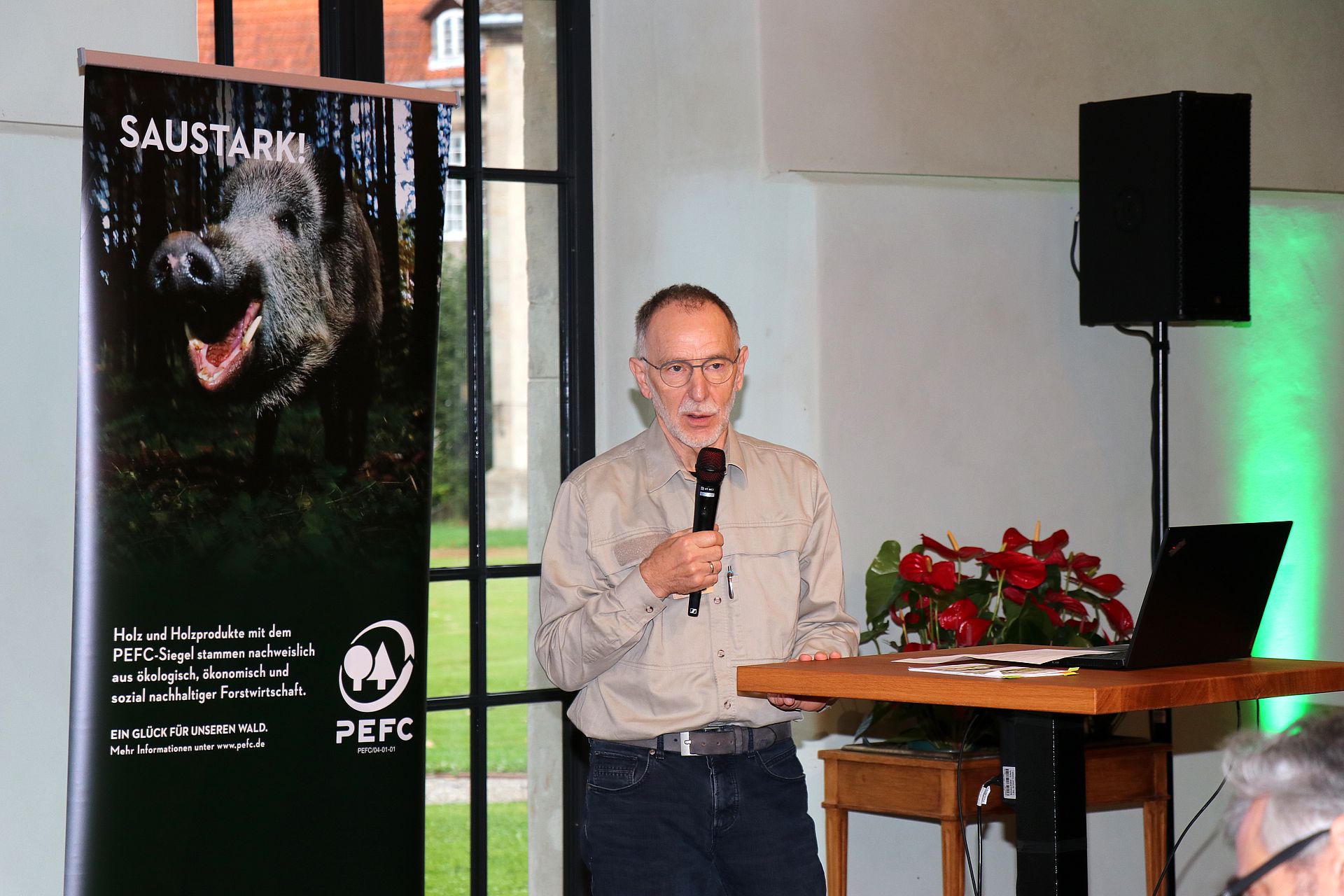 Karl-Gerhard Nassauer, Vorsitzender der Regionalen PEFC-Arbeitsgruppe Hessen, bei der Eröffnung des PEFC-Wald-Wild-Seminars in Willebadessen. (c) PEFC/KOLLAXO Markt und Medien GmbH