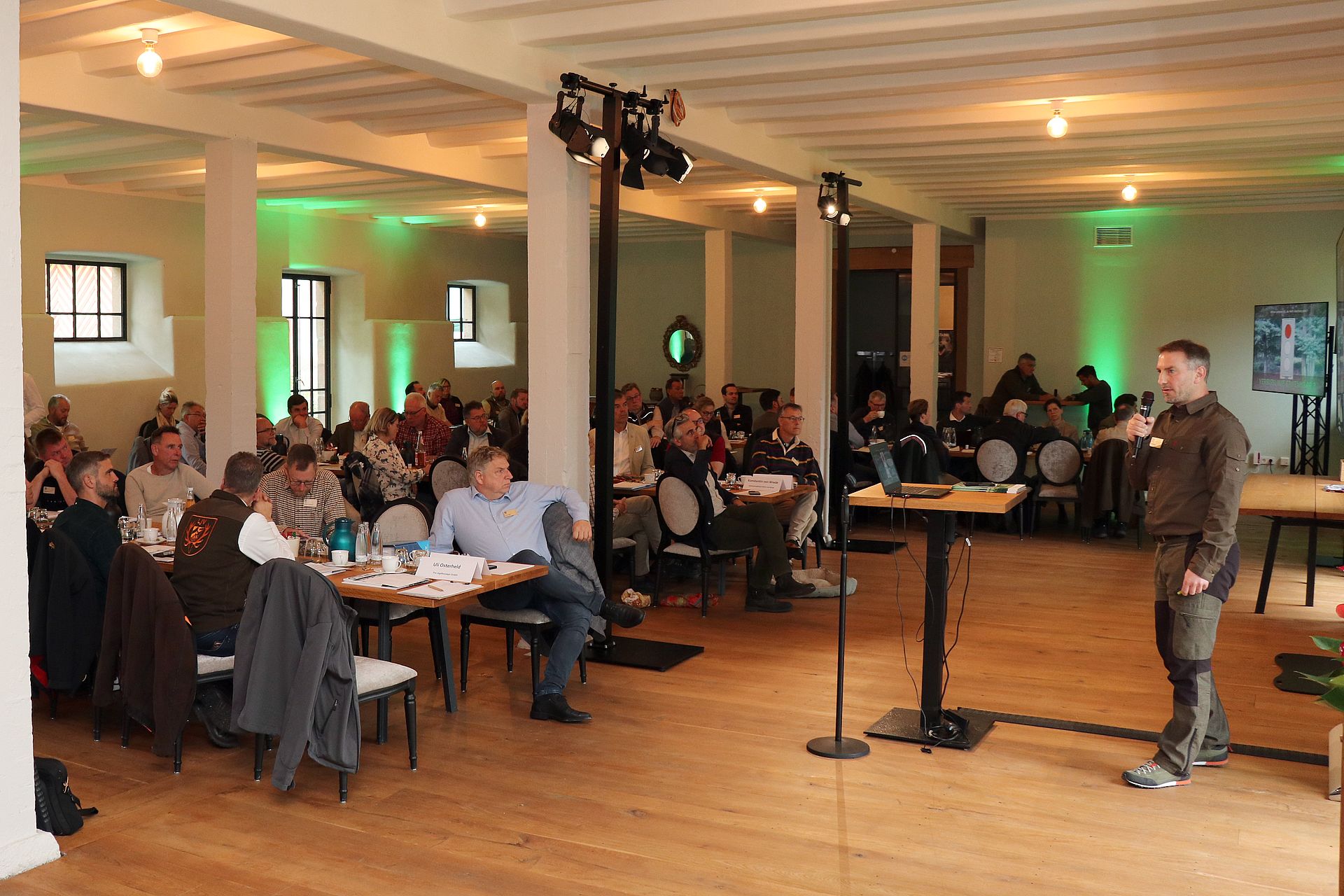 Nach einem Grußwort des Schlossherrn Konstantin Freiherr von Wrede zeigte Uli Osterheld (Pro Jagdkonzept GmbH) praxisnah, wie moderne Bejagungskonzepte aussehen können. Er motivierte dazu, zunächst den Ist-Zustand zu dokumentieren und auf diesem Fundament einen Maßnahmenplan aufzustellen. Alle Jagdtätigkeiten sollten erfasst werden, beispielsweise, wie viele Ansitze ein Abschuss erfordert. Die dokumentierte Wilddichte müsse Ende Januar ihren tiefsten Punkt erreicht haben, damit sich die Natur im Frühjahr erfolgreich selbst verjüngen und auf Wildverbissschutz verzichtet werden kann.