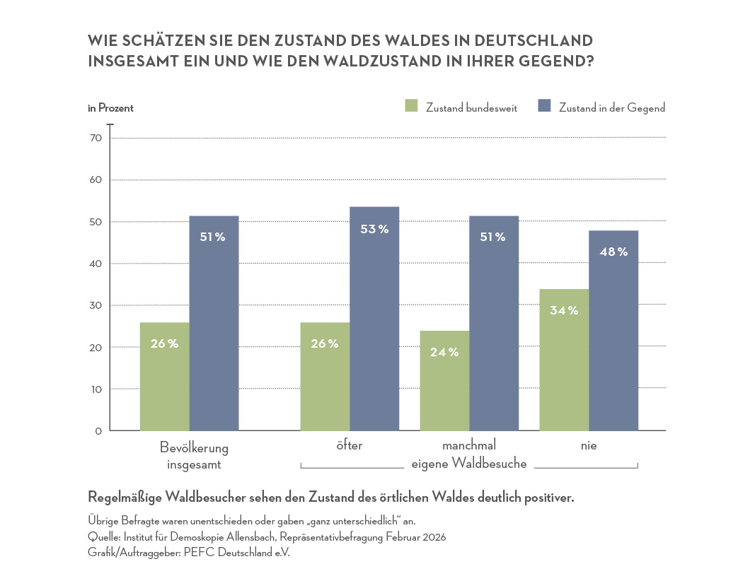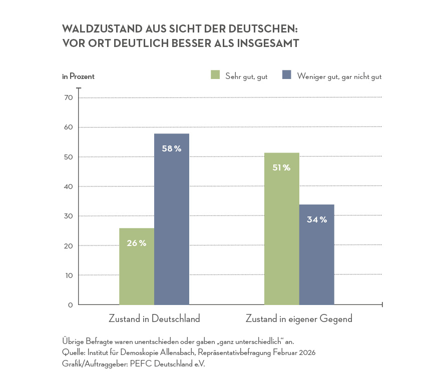 Stuttgart, 16.03.2026 - Pressemitteilung. Zum Tag des Waldes am 21. März 2026 zeigen aktuelle Ergebnisse einer repräsentativen Bevölkerungsbefragung in Deutschland: Die Menschen blicken mit Sorge auf den allgemeinen Zustand der Wälder im Land – bewerten jedoch den Wald in ihrer unmittelbaren Umgebung deutlich besser. Die Studie wurde vom Institut für Demoskopie Allensbach im Auftrag von PEFC Deutschland im Februar 2026 durchgeführt. Befragt wurden 1.052 Personen ab 16 Jahren.