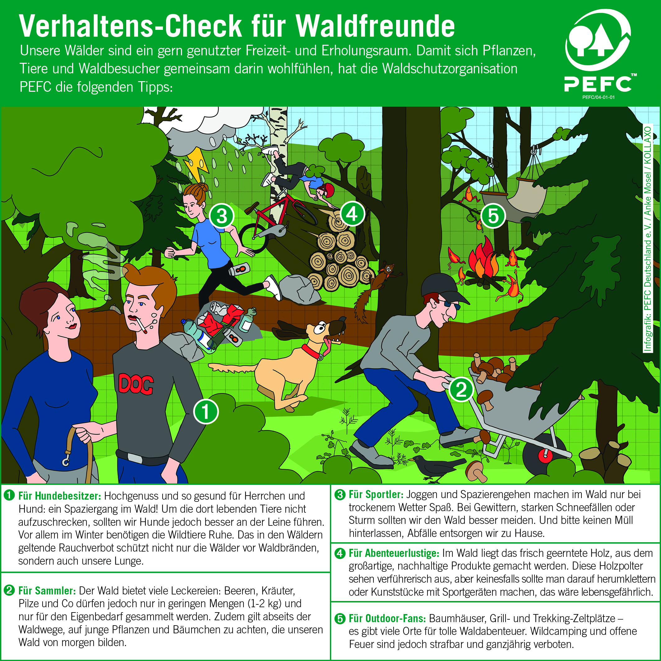 Eine Art "Wald-Knigge" über vorbildliches Verhalten im Wald. Weitere Textinformationen dazu, die Sie ebenfalls nutzen können, finden Sie unter www.pefc.de/neuigkeiten/verhaltens-check-fuer-waldfreunde