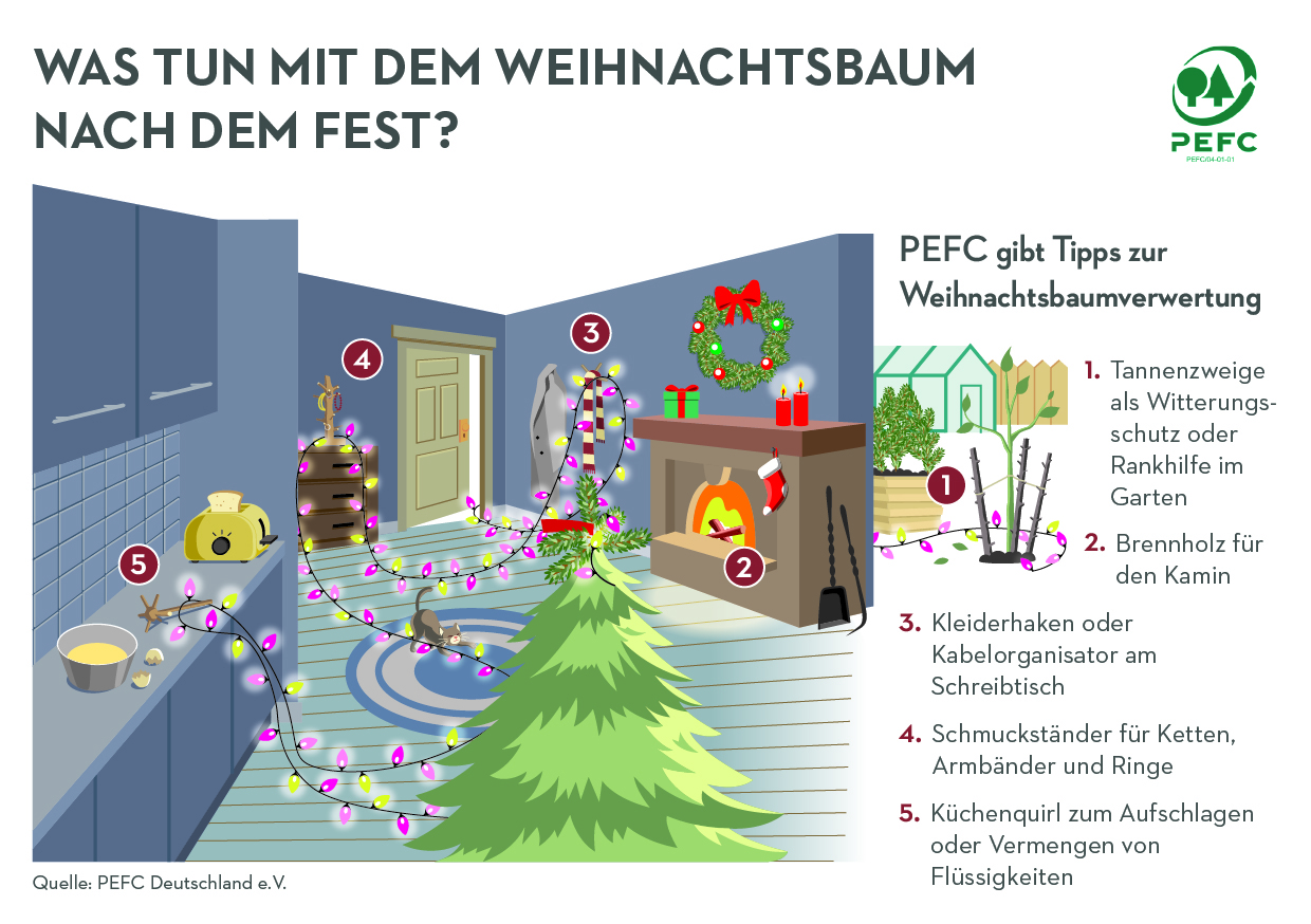 Die PEFC-Infografik "Was tun mit dem Weihnachtsbaum nach dem Fest?" können Sie in den folgenden Dateiformaten herunterladen und kosten- und lizenzfrei einsetzen: