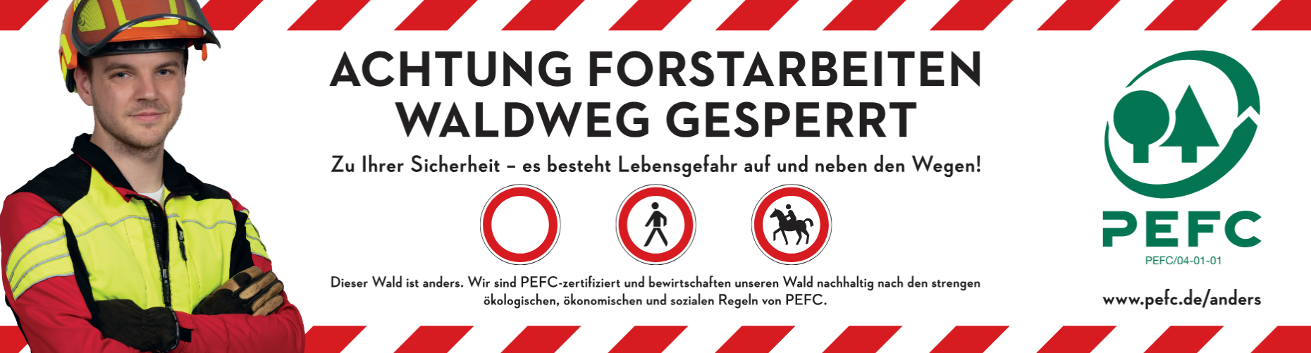 Das neue PEFC-Absperrbanner zur Wegeabsicherung bei Forstarbeiten im Wald kann ab sofort bestellt werden! Mit seiner Umrandung aus rot-weißen Warnfarben kennzeichnet es eindeutig eine Verbotszone. Zusätzlich signalisieren Verbotszeichen, dass der Waldweg gesperrt ist. Neben diesen Warnhinweisen verweist das Absperrbanner auf die PEFC-Zertifizierung des Waldes und enthält einen Link zu weiteren Informationen über PEFC-zertfizierte Waldbewirtschaftung. So können Waldbesuchende sich eingehender über die ökologisch, ökonomisch und sozial nachhaltige Waldbewirtschaftung informieren.