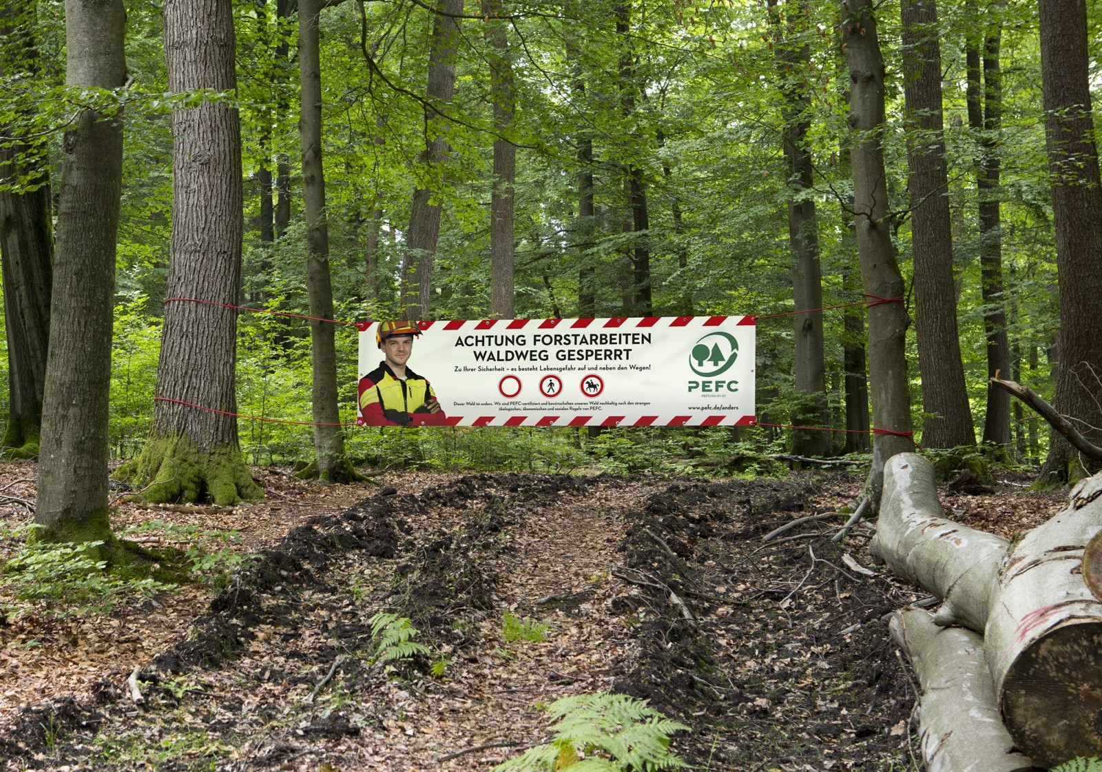 PEFC-Absperrbanner zur Wegeabsicherung bei Forstarbeiten im Wald